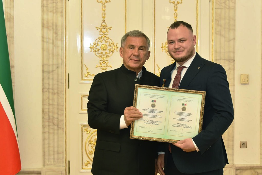 На фото: Рустам Нургалиевич Минниханов и Адель Линнарович Загретдинов, награждение премией Президента РТ