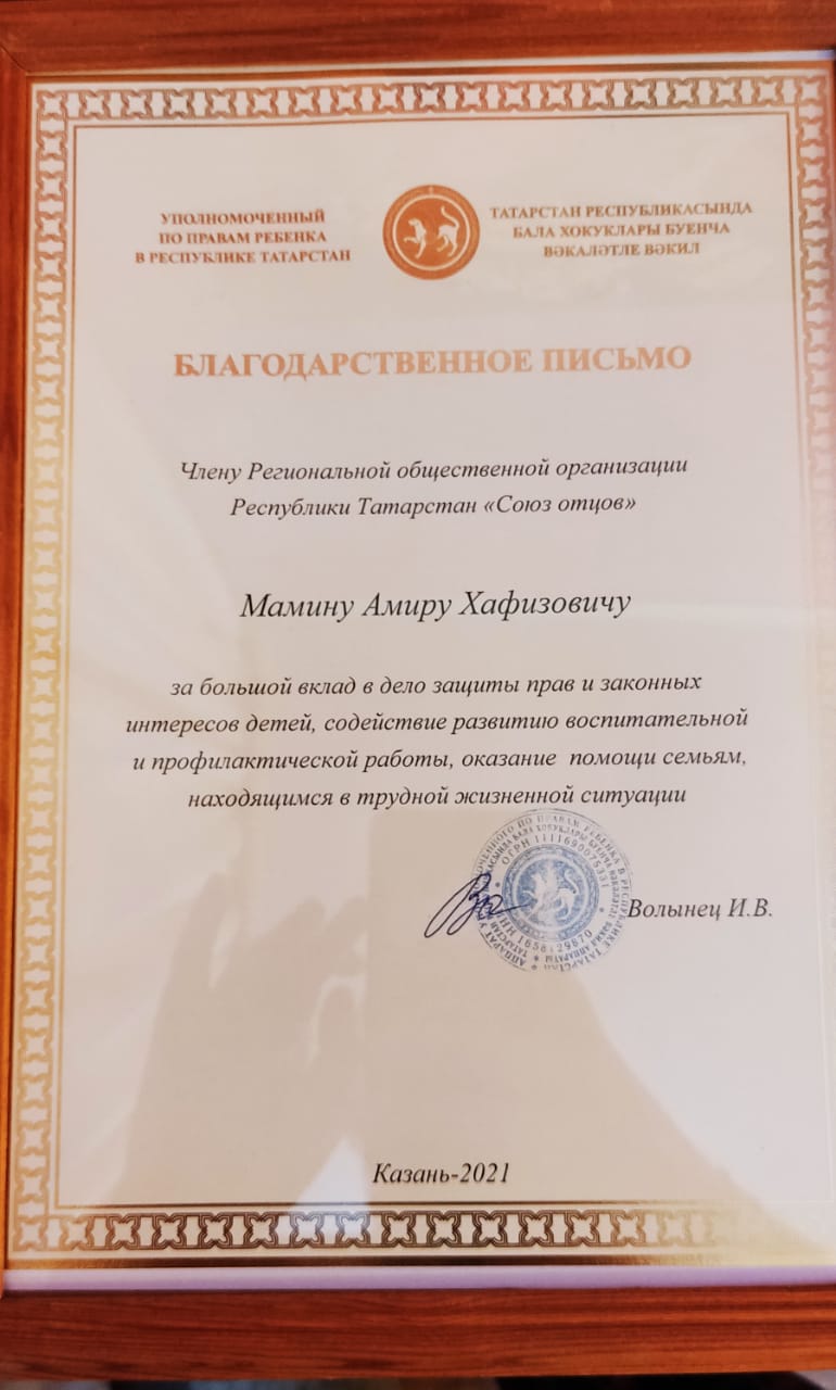 Обратился в Союз Отцов Татарстана за правовой помощью в вопросе, связанном с соблюдением прав моей дочери. Нам оказали на столько мощную поддержку, что я решил вступить в ряды участников данной общественной организации, чтобы в дальнейшем также помогать детям и родителям. Особенную благодарность хочу выразить Амиру Мамину и Рустему Гараеву, которые бескорыстно помогли больше, чем все юристы, которых я до этого нанимал.